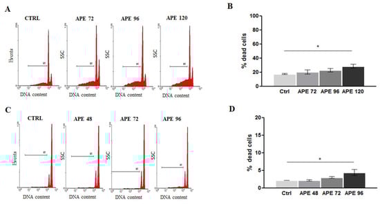 Cell death was evaluated by flow cytometry analysis using propidium iodide (PI) staining. Cells were plated into flask T25 at density of 4 × 104 cells/cm2 and the day after treated with 10−4 M APE for 72, 96, and 120 h for GB8 cells and 48, 72, and 96 h for GB7 cells. Then, the cells were collected, suspended in 2 mL of PBS buffer containing 0.1% Triton X-100 (Sigma-Aldrich, St. Louis, MO, USA), incubated for 5 min at RT, and subsequently stained with PI (10 μg/mL) and analysed by using a Coulter Epics XL flow cytometer. For each sample, 104 events were recorded. Cells with a hypodiploid DNA content and a higher granularity (SSC) at G0-G1 phase (sub-G1) were quantified as dead cells [22,23].