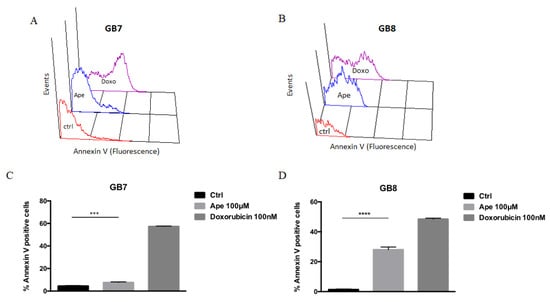 Distribution diagram of Annexin V expression in GB7 (A) and GB8 (B) cells. Percentage of Annexin V positive cells in GB7 (C) and GB8 (D) cultures after 100 μM APE treatment. Doxorubicin (100 nM) was used as a positive control. (t-test; APE 72 h vs. Crtl *** p < 0.001; **** p < 0.0001). The data are the average ±SEM of three independent experiments.