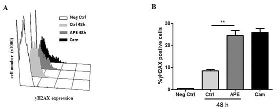 (A) Distribution diagram of p-γH2AX expression vs. cell number (×1000). (B) Percentage of p-γH2AX positive cells in GB8 cells after 100 μM APE treatment. Camptothecin (5 µM) was used as a positive control. (t-test; APE 48 h vs. Crtl ** p < 0.01). The data are the average ±SEM of three independent experiments.