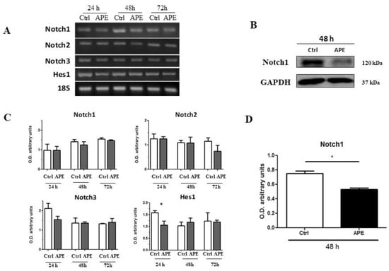 (A) RT-PCR analysis for Notch1, Notch2, Notch3, and Hes transcripts in GB7 cells. 18 S was used as a housekeeping gene. (B) Notch1 expression by Western blot analysis in GB7 cells. GAPDH was used as the internal reference protein. (C) Densitometric analysis of the RT-PCR bands indicated in Figure A normalized with the bands of housekeeping gene 18 S. The data are the average ±SEM of three independent experiments. (D) Densitometric analysis of Notch1 immunoreactive bands; Western blot normalized with the bands of the reference protein GAPDH. The data are the average ±SEM of three independent experiments (* p < 0.05 t-test).