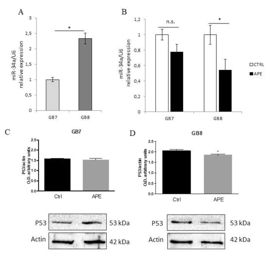 qRT-PCR analysis for miR-34a-5p expression in GB7 and GB8 cells. (A) miR-34a-5p levels in untreated GB7 or GB8 cultures. MiRNA relative expression in GB7 was set as one and snRNA U6 used as an internal standard. Data are expressed as the average ±SEM. (N = 3, * p ≤ 0.05, t-test). (B) miR-34a-5p levels in untreated (CTRL) or APE-treated (100 μM for 24 h) GB7 or GB8 cells. For each cell line, miRNA relative expression in CTRL samples was set as one and snRNA U6 used as an internal standard. Data are expressed as the average ±SEM. (N = 3, * p ≤ 0.05, t-test). Western blot analysis of p53 expression in GB7 (C) and GB8 (D) cells in absence (ctrl) and presence of 100 µM APE (48 h). The graphs above report the densitometric analysis of the p53 immunoreactive bands normalized with the bands of the reference protein β-actin. The data are the average ±SEM of three independent experiments (t-test; * p < 0.05).