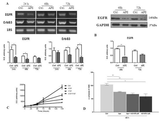(A) RT-PCR analysis of EGFR and ErbB3 receptors in GB7 cells. 18 S was used as a housekeeping gene. The graphs below show the densitometric analysis of the bands of RT-PCR indicated in Fig. A normalized with the bands of housekeeping gene 18 S. The data are the average ±SEM of three independent experiments (* p < 0.05 t-test). (B) EGFR expression by Western blot analysis on GB7 cells. GAPDH was used as an internal reference protein. The graph below shows the densitometric analysis of the bands of Western blot analysis for EGFR normalized with the bands of the reference protein GAPDH. The data are the average ±SEM of three independent experiments (** p < 0.01 t-test). (C) MTT assay performed on GB7 cells maintained in complete culture medium containing EGF and FGF (ctrl) either in the absence of FGF, or of EGF, or in absence of both growth factors. (D) MTT assay performed after 48 h of treatment with 100 μM APE or 1 μM of TKI AG1478 inhibitor (t-test; * p < 0.05; ** p < 0.01). The data are the average ±SEM of three independent experiments performed in triplicate.