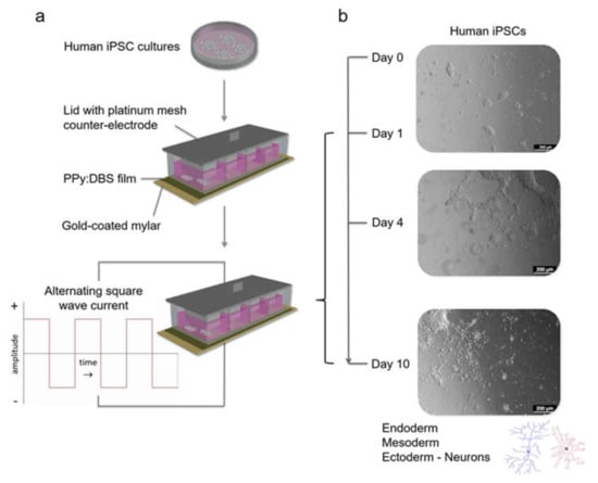 - Stewart, E.; Kobayashi, N.R.; Higgins, M.J.; Quigley, A.F.; Jamali, S.; Moulton, S.E.; Kapsa, R.M.; Wallace, G.G.; Crook, J.M. Electrical stimulation using conductive polymer polypyrrole promotes differentiation of human neural stem cells: A biocompatible platform for translational neural tissue engineering. Tissue Eng. Part. C. Methods 2015, 21, 385–393. [Google Scholar] [CrossRef]