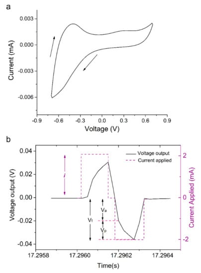 Cyclic voltammetry (CV) was performed using a CH Instruments 660D electrochemical workstation (Austin, TX, USA). The three-electrode cell consisted of a 3 cm2 PPy: DBS coated working electrode, a platinum mesh counter electrode, and an Ag|AgCl reference electrode. Scanning was performed in phosphate-buffered saline (PBS) at a rate of 0.1 V/s over a potential range of −0.7 to +0.7 V.