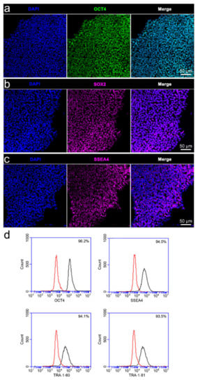 Immunophenotypic characterisation of the iPSCs: (a–c) iPSCs cultured on PPy:DBS substrate and stained with nuclear DAPI colocalised with pluripotency markers (a) Oct4, (b) SOX2, and (c) SSEA4. (d) Flow cytometry of the iPSCs confirming high level expresson OCT4, SSEA4, TRA-1-60, and TRA-1-8 (black histograms). Red histograms indicate the isotype controls. Scale bars as indicated.