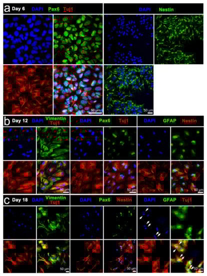 Immunophenotypic characterisation of iPSC differentiability: expression of neuroectodermal progenitor cell markers Pax6, nestin, and vimentin, early neuronal marker Tuj, and glial cell marker GFAP at (a) day 6, (b) day 12, or (c) day 18 of iPSC differentiation. Day 18 cell cultures were distinguished by more prominent neurite outgrowths emanating from Tuj1-expressing neurons. GFAP-expressing cells frequently appeared contigous with neurons, signified by two adjacent DAPI-labelled nuclei (arrows) and converged fluorescent labelling of adjoining glia and neurons. Scale bars as indicated.