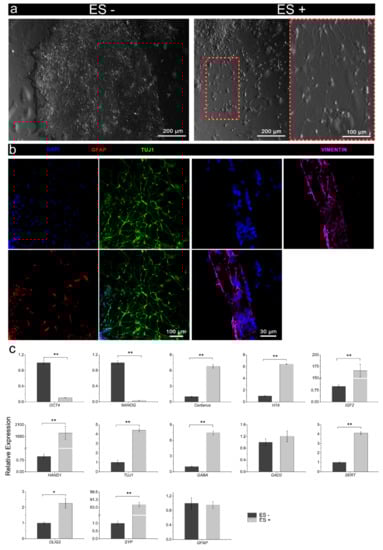 Characterisation of the iPSCs following electrical stimulation (ES+) versus no stimulation (ES-) without chemical inducers. (a) Bright-field micrographs of ES- (left panel) and ES+ (right panel) iPSC cultures, with ES- cultures consisting of classical iPSC-colonies with high-density undifferentiated cells, while ES+ cultures consisted of more dispersed and differentiated cells with clear neuronal morphology. ES+ cell cultures were distinguished by polarised neurons possessing dendritic arborizations and elongated axonal-like projections. (b) Immunophenotyping confirmed the neural induction of ES+ cultures, showing high-density Tuj1-expressing neurons with diffuse intersecting neurites, and to a lesser extent GFAP-expressing cells, as well as cells expressing the neuroectodermal progenitor cell marker vimentin. Scale bars as indicated. (c) Comparative gene expression (pluripotency: OCT4, NANOG; endodermal: Cerberus, H19; mesodermal: IGF2, HAND1; neuroectodermal: TUJ1, GABA, GAD2, SERT, OLIG2, SYP, GFAP) of the iPSCs following electrical stimulation (ES+) or without electrical stimulation (ES-). Relative gene expression represents data normalized to β-actin and expressed relative to the non-stimulated iPSCs. Mean ± S.D.; n = 3. One-way ANOVA with a Bonferroni post hoc test. *p < 0.01; **p < 0.001.
