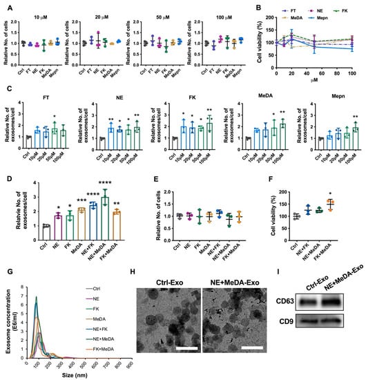 Figure 1. Effects of small molecules on MSC cell viability and exosome production efficiency. (A) Cell proliferation rate. (B) The cell viability and metabolism of mesenchymal stem cells (MSCs) treated with different doses of compounds measured by the 3-(4,5-dimethylthiazol-2-yl)-2,5-diphenyl tetrazolium bromide (MTT) assay. (C) The production efficiency of exosomes derived from MSCs treated with different doses of compounds. (D) The production efficiency of exosomes derived from different MSCs treated with combinations of compounds. (E) The cell proliferation rate of MSCs in response to treatment with small molecule modulators. (F) The cell viability and metabolism of MSCs after treatment with small molecule modulators measured by the MTT assay. (G) The size distribution of exosomes by nanoparticle tracking analysis (NTA) in response to the treatment of MSCs with small molecule modulators. (H) Transmission electron microscopy (TEM) images of exosomes, scale bar 200 = nm, Exo: Exosomes. (I) CD63 and CD9 exosomal surface marker protein expression by Western Blotting. One-way ANOVA with Dunnett’s multiple comparisons test; * p < 0.05, ** p < 0.01, *** p < 0.001, **** p < 0.0001, n = 3–6 each group. FT: fenoterol; NE: norepinephrine; FK: forskolin; MeDA: N-methyldopamine; Mepn: mephenesin.