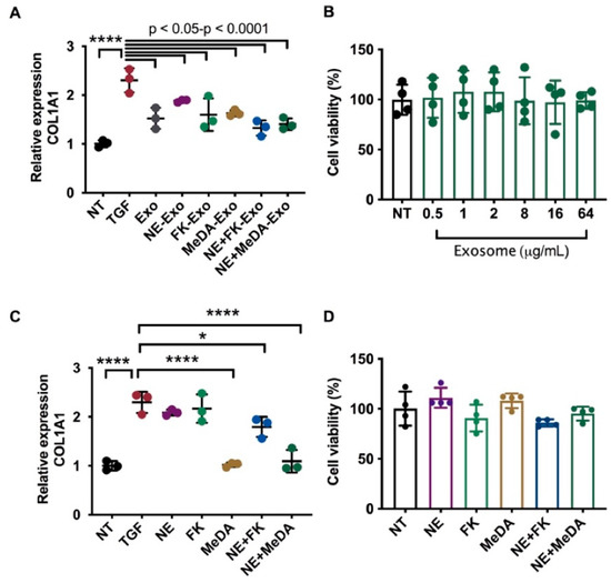 We further tested the direct effects of the small molecule modulators on collagen expression, macrophage polarization and angiogenesis. First, we found that MeDA treatment significantly inhibited TGF-β-induced collagen expression but not cell viability. (Figure 2C,D). Second, NE and MeDA significantly increased M2-macrophage markers (Arg1 and CD206) and decreased IL6. (Supplementary Figure S3). Third, NE and FK treatment did not affect tube formation, while 100 μM MeDA alone or co-dosed with NE significantly impaired angiogenesis (Supplementary Figure S3). Given that the exosomes derived from MSCs treated with NE and MeDA had similar biological effects compared to exosomes derived from non-treated cells, it is highly likely that NE and MeDa were incorporated at very low amounts into the exosomes. This is in line with studies showing that the pre-treatment of cells with small molecules results in extremely low exosomal loading [27]. For example, Pascucci et al. demonstrated that after 24h treatment with 2.3 µM of paclitaxel, MSCs were able to package only 0.02–0.04% of the total paclitaxel dose given (corresponding to 0.5–1 nM) into exosomes. This is 100-fold lower than the lowest concentration that we tested in the macrophage polarization assay [38].