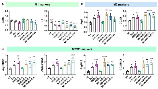 Figure 3. Polarization of macrophages with compound-treated MSC-derived exosomes. (A) Inflammatory macrophage (M1) markers iNOS and IL6. (B) Anti-inflammatory macrophage (M2) markers Arg1 and CD206. (C) M2/M1 ratios. One-way ANOVA with Dunnett’s multiple comparisons test, * p < 0.05, ** p < 0.01, *** p < 0.001, **** p < 0.0001; n = 3.