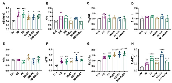 Figure 5. The effect of small molecule compounds on exosomal production-related pathways after 48 h treatment. RT-PCR quantification of (A) nSMase2 (SMPD3), (B) Hrs, (C) Tsg101, (D) Stam1, (E) Alix, (F) microphthalmia-associated transcription factor (MITF), (G) Rab27a, and (H) Rab27b. One-way ANOVA with Dunnett’s multiple comparisons test, * p < 0.05, ** p < 0.01, *** p < 0.001, **** p < 0.0001; n = 3–5.