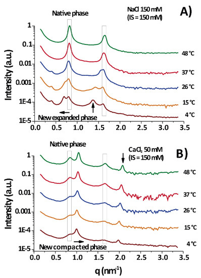 Under physiological conditions (NaCl 150 mM/150 mM IS) PMMs normally show a series of major diffraction peaks (enclosed in vertical boxes in Figure 1) located at ≈0.8 and ≈1.6 nm−1 [24]; they correspond to a membrane period of = 7.7 ± 0.2 nm. Consequently, these are the only peaks in Figure 1A at 37–48 °C. It is seen that the native period (vertical box) was present in almost all temperature–IS conditions.