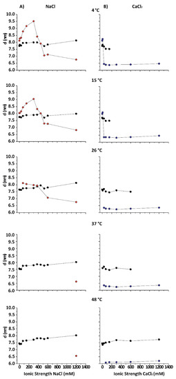 Periodicities () for PMMs phases under various temperature and IS conditions: (A) for NaCl solutions and (B) for CaCl2 solutions; the numbers in panels refer to temperature. The nearly horizontal lines (black symbols) at d ≈ 7.4–8.0 nm indicate the native phase. Upper values are traditionally defined as the expanded, separated, or partially swelled phase, and lower values correspond to the (over)compacted phase. Several measurements, but not all, were taken in two independent repetitions, and the error was estimated to be between ≈0.2 nm (compacted and native phases) and ≈0.3 nm (expanded phase). Black dots: native phase; red dots: non-native phase in NaCl; blue dots: non-native phase in CaCl2.