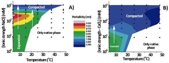 Lamellar period of the non-native phases of PMMs as a function of temperature and IS in aqueous salt solutions based on NaCl (A) and CaCl2 (B). The white regions designate sections of the phase diagram in which only the native phase existed. The vertical arrows represent isothermal paths for the transformation expanded into (over)compacted states, and the black dots are the measured data points for each temperature and IS.