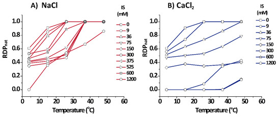 Relative diffracting power () of the native phase as a function of temperature and IS. Data for PMMs in aqueous salt solutions based on NaCl and CaCl2 are shown in panels (A) and (B), respectively.