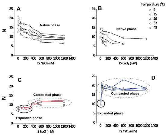 Figure 5 shows that the native period myelin was highly variable and grew up to a limiting value of 12–20 lamellae in the direction of heating as the non-native phases disappeared. Irrespective of the salt type, N decreased with increasing IS. It is known that CNS myelin persists in a packed state, even in pure water (IS = 0), which is in contrast to PNS myelin that swells and loses its lamellar correlations [13]. For the non-native periods, the data grouped into two distinct regimes that were not very responsive to temperature (encircled areas in Figure 5C,D). The values for the expanded period are about ≈ 9 ± 2 correlated bilayers, which agrees with the well-known transverse stacking of membrane domains in myelin membranes [13]. The (over)compacted phase is more highly correlated, with N = 10–20, as was reported earlier [25]. These observations led us to conclude that the non-native phases, no matter whether they are induced by NaCl or CaCl2, are largely non-responsive to environmental conditions once they are nucleated (encircled in Figure 5C,D), although the (over)compacted phase induced by CaCl2 appeared to be somewhat more strongly correlated.