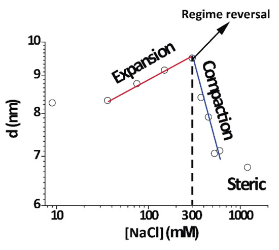An important finding in this work was the direct and continuous transition between the expanded and compacted phases of PMMs, which was salt-induced and best observed at 4 °C. Figure 6 shows an isothermal cut at 4 °C for different NaCl concentrations (same data as Figure 2A at 4 °C) in a double-logarithmic representation. As can be seen from the distinct linear regimes in this representation, different power laws seemed to characterize the initial expansion (at low NaCl concentrations), the compaction (at intermediate NaCl concentrations), and finally a plateau at high NaCl concentrations, when no further compaction was possible due to short-range repulsive interactions. In contrast to this complex behaviour, the native period of myelin was rather insensitive to the salt concentration because its period was dictated by the protein components [2].
