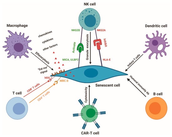 Generally, senescent cells can be removed by apoptosis and the immune system [,]. Because apoptosis evasion features most senescent cells, the immune system, including adaptive and innate immune cells, plays a critical role in the eradication of senescent cells at a young stage or under physiological conditions. Although senescent cells can be induced to undergo apoptosis by senolytics [,,,,], these apoptotic cells must be finally cleared by the immune system. Interaction between senescent and immune cells affects immune system function. Senescent cells recruit and make immune cells senescent and dysfunctional via SASP, leading to persistent and excessive accumulation of senescent cells []. However, the precise mechanism underlying senescent cell accumulation within tissues is still debatable. It is unknown whether this is due to senescent cell increase exceeding the immune system’s ability to clear them or immune cell dysfunction.