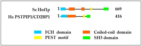 Bearing a domain structure similar to Hof1p, the mammalian Hof1p homologue, PSTPIP1, comprises an N-terminal F-BAR domain (with a Fes/Cip4 Homology or FCH domain and coiled-coil domains), a PEST sequence and a C-terminal SH3 domain [168]. PSTPIP1 was discovered in a yeast two-hybrid screen as an interaction partner of the PEST protein tyrosine phosphatase (PTP-PEST) [147].