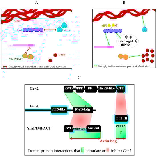 - Sattlegger, E.; Barbosa, J.A.; Moraes, M.C.S.; Martins, R.M.; Hinnebusch, A.G.; Castilho, B.A. Gcn1 and actin binding to Yih1 implications for activation of the eIF2 kinase Gcn2. J. Biol. Chem. 2011, 286, 10341–10355. [Google Scholar] [CrossRef]