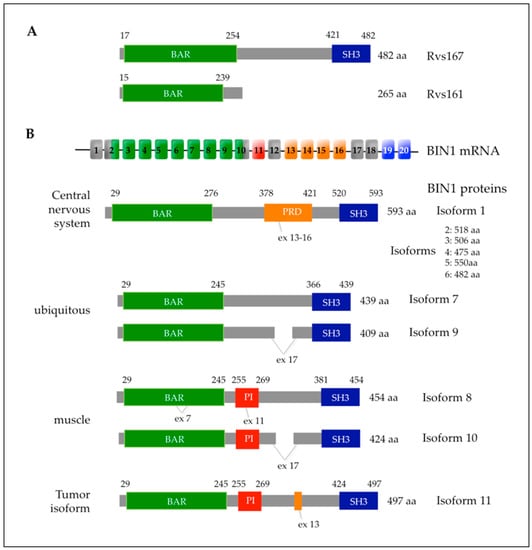 - Prokic, I.; Cowling, B.S.; Laporte, J. Amphiphysin 2 (BIN1) in physiology and diseases. J. Mol. Med. 2014, 92, 453–463. [Google Scholar] [CrossRef]