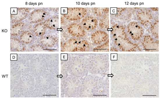 β-galactosidase immunohistochemistry. (A–C) Strong immunostaining of Sertoli cell nuclei in prepubertal SCCx43KO mice confirmed the successful deletion of the Cx43 gene. All other cells, including germ cells (arrows) were immunonegative. (D–F) No immunoreaction in Sertoli cells of WT littermates. Cx43: connexin 43, KO: knockout, pn: post-natum, SCCx43KO: Sertoli cell-specific Cx43 knockout, WT: wild type, scale bars: 50 µm, numerical aperture: 0.75.