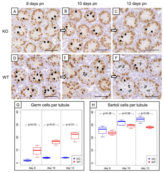 Morphological, histological and immunohistochemical examination (Figure 3A–F) revealed evident differences in the composition of intratubular cells between 8-, 10- and 12-day-old WT and KO littermates. GC numbers per seminiferous tubule amounted on average 2 ± 0.78 GCs in 8-day-old SCCx43KO mice, 3.96 ± 0.54 GCs in 10-day-old SCCx43KO animals and 4.21 ± 0.43 GCs in 12-day-old SCCx43KO mice, whereas WT littermates had, on average, 9.49 ± 3.90 (8 days p.n.), 16.44 ± 1.80 (10 days p.n.) and 21.37 ± 3.50 GCs (12 days p.n.) per seminiferous tubule (Figure 3G).