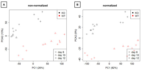 Representation of the expression data on the first two principal components. (A) Raw next-generation sequencing (NGS) data are shown. (B) Normalized data are depicted. KO: knockout, WT: wild type.