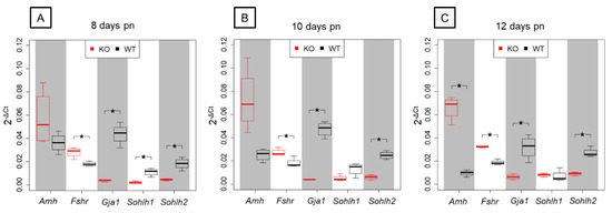 To validate NGS data by qRT-PCR, five candidate genes were chosen according to the following criteria: GC-specific and significantly downregulated (p(FDR) < 0.05) in KO mice (Sohlh1, Sohlh2), SC-specific and significantly upregulated (p(FDR) < 0.05) in murine KO animals (Amh, Fshr) as well as Gja1 that codes for Cx43. β-Actin was selected as a housekeeping gene because no significant regulation at any age and group was observed by NGS.