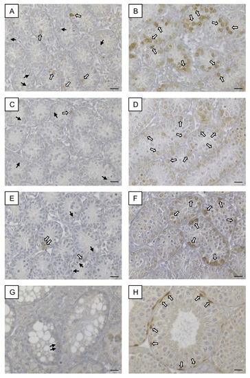 - Steger, K.; Rey, R.; Louis, F.; Kliesch, S.; Behre, H.M.; Nieschlag, E.; Hoepffner, W.; Bailey, D.; Marks, A.; Bergmann, M. Reversion of the differentiated phenotype and maturation block in Sertoli cells in pathological human testis. Hum. Reprod. 1999, 14, 136–143. [Google Scholar] [CrossRef]
