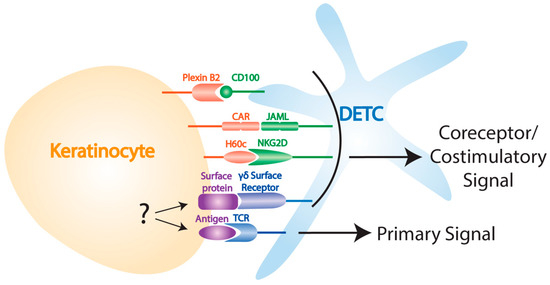 Ligands involved in DETC activation. Keratinocyte-DETC interactions are important for DETC activation post-wounding. Known interactions include CD100-plexin B2, JAML-CAR, NKG2D-H60c, and primary signaling through TCR following interactions with an unknown antigen.