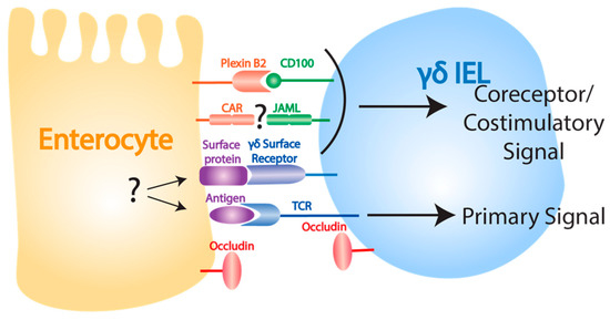 Ligands involved in γδ IEL function. The mechanisms behind γδ IEL activation following intestinal epithelial damage are less well understood than the mechanisms underlying DETC activation in the skin, but plexin B2-CD100 interactions are known to play a role. Intestinal epithelial cells and γδ IELs express CAR and JAML, respectively, but whether these interactions provide a costimulatory signal following epithelial damage is unknown. The role of antigen recognition by TCR and the presence of other costimulatory signals also remain unknown. Occludin expressed by both γδ IELs and intestinal epithelial cells is important for γδ IEL migration.