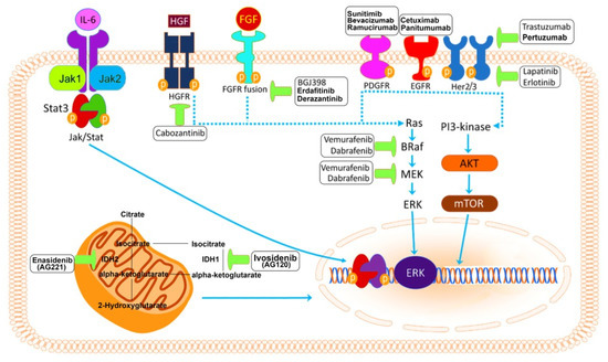Mutations of IDH1 and 2 frequently occur in iCCA [35]. IDH catalyzes the conversion of isocitrate to α-ketoglutarate. Alterations of IDH, through the accumulations of oncometabolites, induces widespread epigenetic changes that have a pleiotropic effect on differentiation, cell growth, and hypoxia signaling [36]. Approximately 14% of iCCA tumors are known to harbor IDH genetic mutations. IDH mutations are less frequently observed in pCCAs and dCCAs [37]. IDH1 mutations are more common than IDH2. Different inhibitors specific to IDH-mutant alleles have been developed. Inhibitors of IDH1 (AG120, IDH305), IDH2 (AG221), and pan-IDH1/2 (AG881) are currently being tested in patients with iCCA.