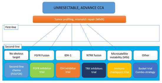 In small studies on CCA tumor samples, PD-L1 expression has been reported in 9%–72% of specimens [101,102,103], and on 46%–63% of immune cells within the tumor microenvironment [101,102,103]. These data indicate that a substantial proportion of CCAs might be amenable to therapy with PD-1 or PD-L1 inhibitors. Moreover, Tumor MMR protein deficiency, which results in the genetic signature of microsatellite instability (MSI), with high rates of somatic mutation and increased expression of tumor-associated antigens, predicts responsiveness to ICI across tumor types. In a whole-exome-sequencing study of 231 CCA tumor samples [34], a median of 39 and 35 somatic non-synonymous mutations were identified in intrahepatic and extrahepatic CCAs, respectively; overall, ~6% of the CCAs had evidence of hypermutation, with concurrent MMR deficiency and/or MSI detected in about 36% of this hypermutated tumors. Accordingly, a recent review of published studies reported up to 10% of iCCAs with MSI or MMR deficiency [104], although other studies suggest a lower frequency. Together, these data suggest that immune-checkpoint blockade and immune-modulating therapies could be promising options for the subgroup of patients with CCAs harboring high mutational loads.
