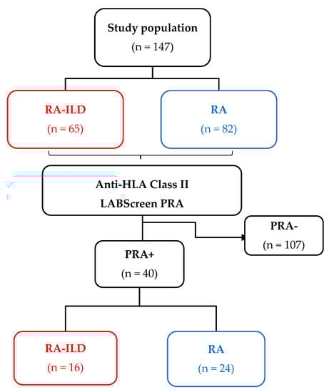 The current study included 147 patients divided into two groups: one with a diagnosis of RA-ILD (n = 65) and another only with RA (n = 82). After the PRA test was performed, the number of patients who tested positive were: RA-ILD (n = 16) and RA (n = 24). See Figure 1.