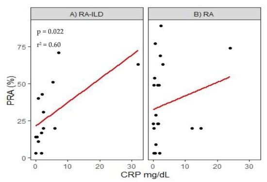 Correlation of CRP levels with PRA (%) in rheumatoid arthritis (RA) patients with or without ILD.