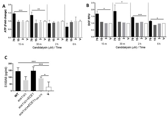Candidalysin the induces release of ATP, ROS/RNS and S100A8 alarmins. ATP (A) and ROS/RNS (B) molecules are released from oral epithelial cells following treatment with 70 µM candidalysin. Initial elevated ATP levels are recovered at 2 h post-treatment, whereas increased ROS/RNS levels are maintained for 6 h. At 24 h post-infection, induction of S100A8 by candidalysin-deficient strains is significantly suppressed (C (grey bars)) when compared to that of candidalysin-expressing strains (C (black bars)). Data are an average of three biological experiments. Unmatched, one-way ANOVA with Bonferroni multiple comparison’s test was used to assess statistical significance. Error bars represent SD, * p < 0.05, ** p < 0.01, *** p < 0.001.