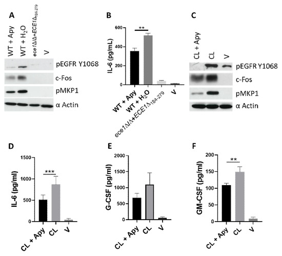 We previously reported the ability of candidalysin to induce EGFR activation and downstream MAPK signalling [12]. Given that both ATP [40] and ROS [41,42,43] are each capable of triggering EGFR activation, we investigated whether either of these molecules were involved in our model of candidalysin-induced EGFR activation. TR146 oral epithelial cells were incubated with the ATP hydrolysing enzyme, Apyrase, or ROS-scavenger, Tempol, prior to candidalysin treatment or C. albicans infection. Reduction in ATP levels via Apyrase treatment significantly suppressed epithelial responses to C. albicans, namely pEGFR, c-Fos, pMKP1 (Figure 3A) as well as IL-6 secretion (Figure 3B), but not IL-1α, IL-1β, G-CSF or GM-CSF (Supplementary Figure S2A–D). Similarly, host responses to candidalysin were also significantly suppressed by Apyrase pre-treatment, which impaired pEGFR, c-Fos, pMKP1, IL-6, G-CSF and GM-CSF induction, though inhibition of G-CSF was not statistically significant (Figure 3C–F). However, no effect on candidalysin-induced hBD2, hBD3, LL37 or IL-1α or IL-1β release was observed following Apyrase treatment (Supplementary Figure S2E–I). Notably, ROS inhibition via Tempol had no suppressive effect on C. albicans- or candidalysin-induced activation of pEGFR, c-Fos or pMKP1 (Supplementary Figure S3A,B). Given this, reduction in cytokine release was not assessed with Tempol. To ensure that Apyrase activity did not result in an overall loss of cellular fitness, we conducted a mitochondrial metabolic assessment (MTT assay) to determine TR146 cell viability following Apyrase treatment. Cell viability was not affected by Apyrase at 3 h or 25 h post-treatment (Supplementary Figure S3C,D), confirming the importance of extracellular ATP in candidalysin-induced EGFR activation, MAPK signalling and consequent IL-6 induction.