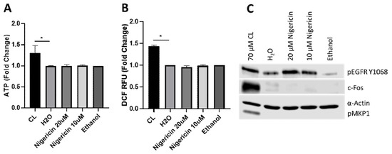 To determine the specificity of candidalysin-induced responses, we compared responses between candidalysin and nigericin, an unrelated pore-forming toxin from the bacterial species Streptomyces hygroscopicus. We found that nigericin was unable to induce ATP or ROS/RNS in oral epithelial cells (Figure 4A,B). While EGFR phosphorylation was induced, downstream MAPK components (c-Fos and MKP1) were not activated (Figure 4C). Thus, while nigericin forms pores and may activate EGFR, it does not induce a comparable biological response to that of candidalysin. The data suggest that ATP release (and subsequent downstream responses) is specific to candidalysin and not a consequence of general pore formation.