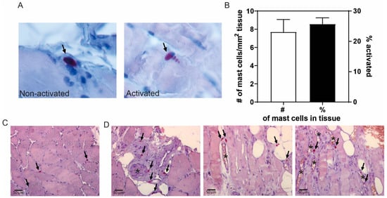 Mast cells in calf muscles of patients with peripheral artery disease. (A) Representative high-magnification image of a non-activated (left) and activated (right) mast cell, stained using a chloro-acetate esterase (CAE) staining and indicated by arrows. The non-activated mast cell shows the pink granula in the cytoplasm of the cell, whereas the pink granula are being released in the surroundings of the activated mast cell. (B) Quantification of the number of mast cells/mm2 tissue, and the percentage of activated mast cells observed (n = 15). (C) Overview of a chloro-acetate esterase (CAE) staining of muscle tissue showing mast cells in pink (indicate by arrows) in between muscle fibers. (D) Representative overview images of mast cells surrounding microvessels (indicated by *) in human calf muscle tissue.