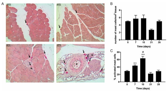 At day 7, a 33% increase in activated mast cells was observed compared to the percentage of activated mast cells at day 0, which further rose to a maximum of a 54% increase at 10 days after HLI. The number of activated mast cells then declined at 21 and 28 days to the level control (day 0; non-surgery) muscles (Figure 2B). Interestingly, most of these activated mast cells, as indicated by granules that reside outside the cell, were found in close proximity of capillaries in the muscle tissues (Figure 2A, lower panels) suggesting a direct relation between blood vessels and mast cells as we have shown previously in atherosclerosis [].