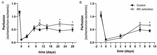Perfusion of the ischemic hind limb in mast cell (MC) activated vs. control mice. Perfusion (ischemic/non-ischemic) as measured by Laser Doppler Perfusion Imaging (LDPI) from day 0 to day 28 in the long-term experiment (A) and in the short-term experiment from day 0 up to day 9 (B) after ligation of the femoral artery. * p-value of < 0.05 between the groups.