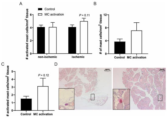 In ischemic mouse hind limbs, the mast cells that colocalized with capillaries were mostly activated early in the revascularization process. Apparently, the ischemic environment in the hind limb causes the mast cells to degranulate. However, the mechanisms via which mast cells are activated upon ischemia remain largely unknown. In ischemia/reperfusion studies, reactive oxygen species, but also alarmins/DAMPS, have been suggested to activate mast cells []. The composition of the mast cell secretome completely depends on the specific stimuli and receptors involved, which indicates that the ischemic microenvironment can influence how mast cells are activated and which mediators these cells secrete. In this study, we aimed to determine whether local mast cell activation using a sensitization and challenge protocol in the ischemic hind limb would improve limb perfusion by inducing neovascularization. Similarly as described previously [], we have established that mast cell activation promotes limb perfusion as indicated by enhanced blood flow to the lower limbs. Previously, it was suggested that neutrophils were the culprit immune effector cells during the neovascularization process in the ischemic hind limb []. In our study, we actually show that mast cell activation induced a pro-inflammatory monocyte response, while not affecting neutrophil numbers, either systemically or locally in the draining lymph nodes. The difference in observed immune response between the studies may be explained by the fact that we analyzed these monocyte responses at nine days after the induction of ischemia, whereas neutrophils are usually early responders and act in the first few days after injury. Furthermore, the difference in mast cell activation methods used may have affected the composition of the releasate, resulting in a difference in immune responses in the two studies. The increased immune response in the draining lymph nodes from the ischemic hind limb was not reflected by a difference in macrophage count in the muscle tissue itself at nine days after ligation. Again, this may be due to the timeframe of the study or to local secretion of pro-inflammatory mediators.
