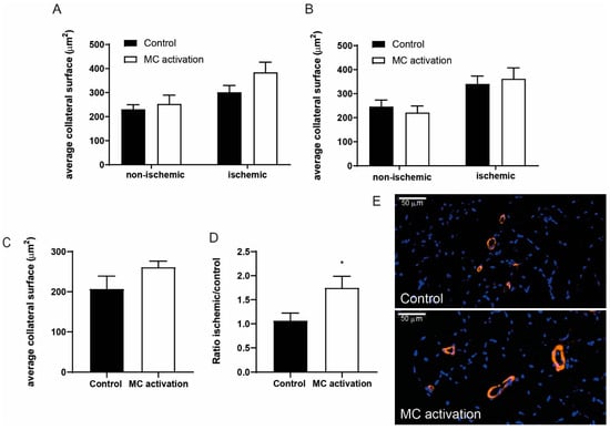 Arteriogenesis upon mast cell activation in the ischemic hind limb. The average collateral surface area in ischemic as compared to non-ischemic adductor muscles of mice in which mast cells were activated compared to controls at (A) 28 days after ligation and (B) 9 days after ligation. (C) The average collateral surface area in the soleus muscle of mice in which mast cells were activated compared to controls. (D) The collateral area ratio between ischemic and non-ischemic soleus muscles in mast cell activated compared to control mice at nine days after femoral artery ligation. (E). Representative pictures of smooth muscle cell actin positive collaterals in orange and nuclei in blue (DAPI) in both a control muscle and a muscle in which mast cells were activated. * p < 0.05.