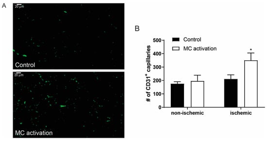 Activated mast cells induce angiogenesis in the ischemic hind limb. (A) CD31 staining of the ischemic soleus muscles shows the presence of CD31+ capillaries in control mice and in mice in which mast cells were activated. (B) Quantification of the number of CD31+ capillaries in non-ischemic and ischemic soleus muscle with (white bars) or without local (black bars) mast cell activation, measured at nine days after femoral artery ligation. *p < 0.05.