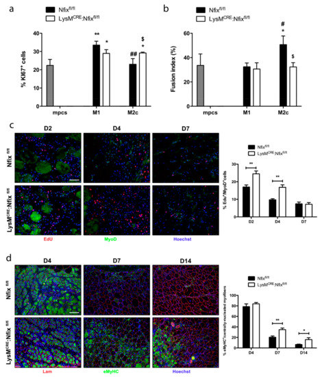 Since depending on their phenotype MPs act differentially on WT myogenic progenitor cells (mpcs), we set experiments of conditioned medium (CM) coming from pro- or anti-inflammatory MPs [37]. We added CM coming from BMDM derived from Nfixfl/fl and LysMCRE:Nfixfl/fl mice on proliferating or differentiating mpcs. We looked at mpc proliferation by mean of Ki67 staining and at their differentiation by the quantification of the fusion index. As expected, CM coming from M1 Nfixfl/fl MPs stimulated the proliferation of mpcs, while M2c CM had no effect (Figure 4a and Figure S4a). Similarly, CM coming from M1 LysMCRE:Nfixfl/fl MPs stimulated at the same extent the proliferation of mpcs (Figure 4a and Figure S4a). Interestingly, CM from M2c LysMCRE:Nfixfl/fl MPs stimulated the proliferation of mpcs as M1 CM does (Figure 4a and Figure S4b), whereas CM coming from both Nfixfl/fl and LysMCRE:Nfixfl/fl M1 MPs had no effect on the fusion index of mpcs (Figure 4b and Figure S4b). While M2c Nfixfl/fl MPs CM increased the fusion of mpcs compared to M1 Nfixfl/fl CM, the CM from M2c LysMCRE:Nfixfl/fl MPs lost its pro-fusion effect (Figure 4b and Figure S4b ). We also investigated if the lack of Nfix in MPs affects myogenic cells in vivo. To quantify mpcs proliferation, we injured, using CTX, the TA of both Nfixfl/fl and LysMCRE:Nfixfl/fl mice and we injected EdU 12 h before sacrifice. The proliferation of SCs (EdU+/Pax7+ cells) was identical between the two models at all the time points analyzed (Figure S4c). On the contrary, the percentage of EdU+/MyoD+ cells at D2 and D4 was higher in the LysMCRE:Nfixfl/fl mice compared to Nfixfl/fl mice (Figure 4c). To quantify the number of newly formed myofibers, we performed an immunofluorescence for eMyHC (embryonic Myosin Heavy Chain) on both injured mouse models (Figure 4d). At D4, the percentage of myofibers positive for eMyHC was around 80%, meaning that almost all myofibers were formed de novo (Figure 4d). At D7, 20% of the Nfixfl/fl myofibers were positive for the eMyHC and only 6.5% at D14 (Figure 4d). On the contrary, at D7 and D14 we observed an increase in the number of eMyHC+ myofibers in the LysMCRE:Nfixfl/fl mice (34.7% and 15.8% respectively) (Figure 4d). To conclude, Nfix is necessary to MPs to adopt an anti-inflammatory phenotype and, consequently, function. The defect of the phenotypical switch due to the absence of Nfix results in a persistence of pro-inflammatory MPs in the injured muscle, leading to a continuous proliferation of MyoD+ cells. The absence of anti-inflammatory MPs induces a delay in the differentiation of new myofibers and, therefore, in the proper muscle regeneration.
