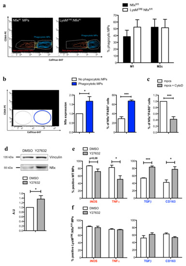 We recently demonstrated that the inhibition of the RhoA-ROCK1 pathway induces Nfix expression in fetal myoblasts and numerous studies have shown that the inhibition of RhoA-ROCK1 increases the phagocytosis, while its stimulation prevents phagocytosis [39,40,41,42,43]. Thus, we treated WT MPs with Y27632, an inhibitor of ROCK1, and after 1 h of treatment, the phosphorylation of ROCK1-target Mypt decreased, meaning that the inhibition of RhoA-ROCK1 pathway was effective (Figure S5e). After 16 h of treatment, Y27632-treated WT MPs exhibited an increase of Nfix protein (Figure 5d); most importantly, this increase led to a reduction of pro-inflammatory markers and an increase of anti-inflammatory markers (Figure 5e). On the contrary, this switch through an anti-inflammation phenotype did not occur in LysMCRE:Nfixfl/fl MPs treated with Y27632 (Figure 5f). These results show that RhoA-ROCK-dependent phagocytosis induces the expression of Nfix, which in turn is necessary to promote the phenotypical switch of MPs from pro- to anti-inflammatory.
