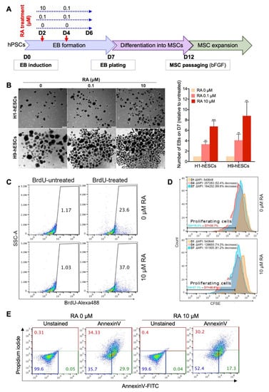 Short-term all-trans-retinoic acid (RA) treatment enhances embryoid body (EB) formation by inducing cell proliferation and survival. (A) Experimental scheme for the differentiation of human pluripotent stem cells (hPSCs) into mesenchymal stem cells (MSCs). (B) Representative images of H1 and H9 hESC-derived EBs showing the effect of RA concentration on EB formation (n = 4). The EBs were quantified at D7 of differentiation. The results presented in the bar graph are means ± SD for three independent experiments. * p < 0.05, ** p < 0.01 and *** p < 0.001 versus untreated EBs (0 µM) (Dunnett’s test). (C,D) Effect of RA treatment of the proliferation of EB-forming cells. (C) Flow cytometry analysis of BrdU incorporation during 19 h in D3-old H9-derived EBs treated or not with 10 µM RA for 6h at D2. The gates on the dot plots represent BrdU-positive cells and are representative of two independent experiments. (D) CFSE cell proliferation assay performed on H9-derived EB forming cells untreated (upper histogram) or treated (lower histogram) with RA (10 µM treatment condition). The H9-hESCs were stained with CFSE on D0 just before EB induction then CFSE staining decrease in proliferating cells was assessed overtime by flow cytometry. (E) Effect of RA treatment on the viability of EB-forming cells. H9-derived EBs were treated on day 2 with 10 µM RA for 4 h then stained using Annexin V-FITC and propidium iodide and analyzed by flow cytometry. The percentages of viable (blue), early apoptotic (green) and late-apoptotic/necrotic (red) cells are indicated on the dot plots and are representative of two independent experiments.