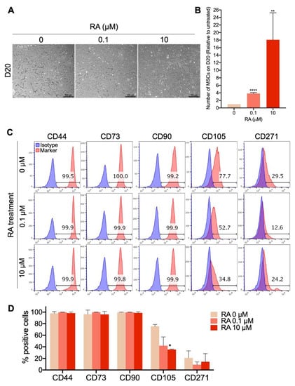 Short-term RA treatment enhances the yield of MSCs differentiated from hPSCs. H9-hESCs were differentiated into MSCs under the three different RA treatment conditions (0, 0.1 and 10 µM). MSC morphology, yield and phenotype were assessed on day 20 of differentiation. (A) Representative images of the differentiated fibroblast-like cells from at least 4 independent experiments are shown. (B) The numbers of MSC-like cells obtained under each of the RA treatment conditions were counted. The results presented in the bar graph are means ± SD for four independent experiments. ** p < 0.01 and **** p < 0.0001 versus RA untreated EB-derived MSC-like cells (0 µM). (C) Analysis of the expression of the MSC markers CD44, CD73, CD90, CD105 and CD271 in the generated MSC-like cells by flow cytometry. (D) The results presented in the bar graph are means ± SD for five independent experiments. * p < 0.05 versus MSCs derived from RA untreated EBs (0 µM).
