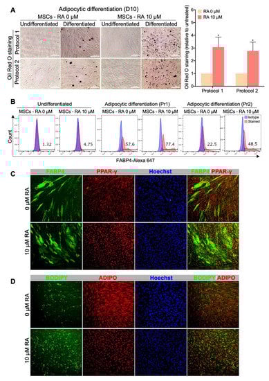 MSCs derived from RA-treated EBs display an enhanced differentiation potential into adipocytic lineage. MSCs obtained from H9-hESC-derived EBs treated or not with 10 µM RA were differentiated into adipocytes using two different previously reported protocols. (A) Representative Oil Red O staining images from at least 3 independent experiments are shown. Undifferentiated MSCs were used as control. The results of the Oil Red O staining quantification are presented in the bar graph as means ± SEM for three independent experiments conducted in duplicates or quadruplicates each. * p < 0.05 versus untreated EBs (0 µM). (B) Quantification of the expression of the adipogenesis marker FABP4 by flow cytometry. The histograms presented are representative of four independent experiments. Pr1 (protocol 1) and Pr2 (protocol 2) indicate the two different adipocytic differentiation protocols used. (C) Immunofluorescence images showing the expression of FABP4 and PPAR-γ in the adipocytes derived from the MSCs obtained from H9-hESC-derived EBs treated or not with 10 µM RA. (D) Immunofluorescence images showing lipid droplet staining by BODIPY and adiponectin (ADIPO) expression in the adipocytes derived from the MSCs obtained from H9-hESC-derived EBs treated or not with 10 µM RA.